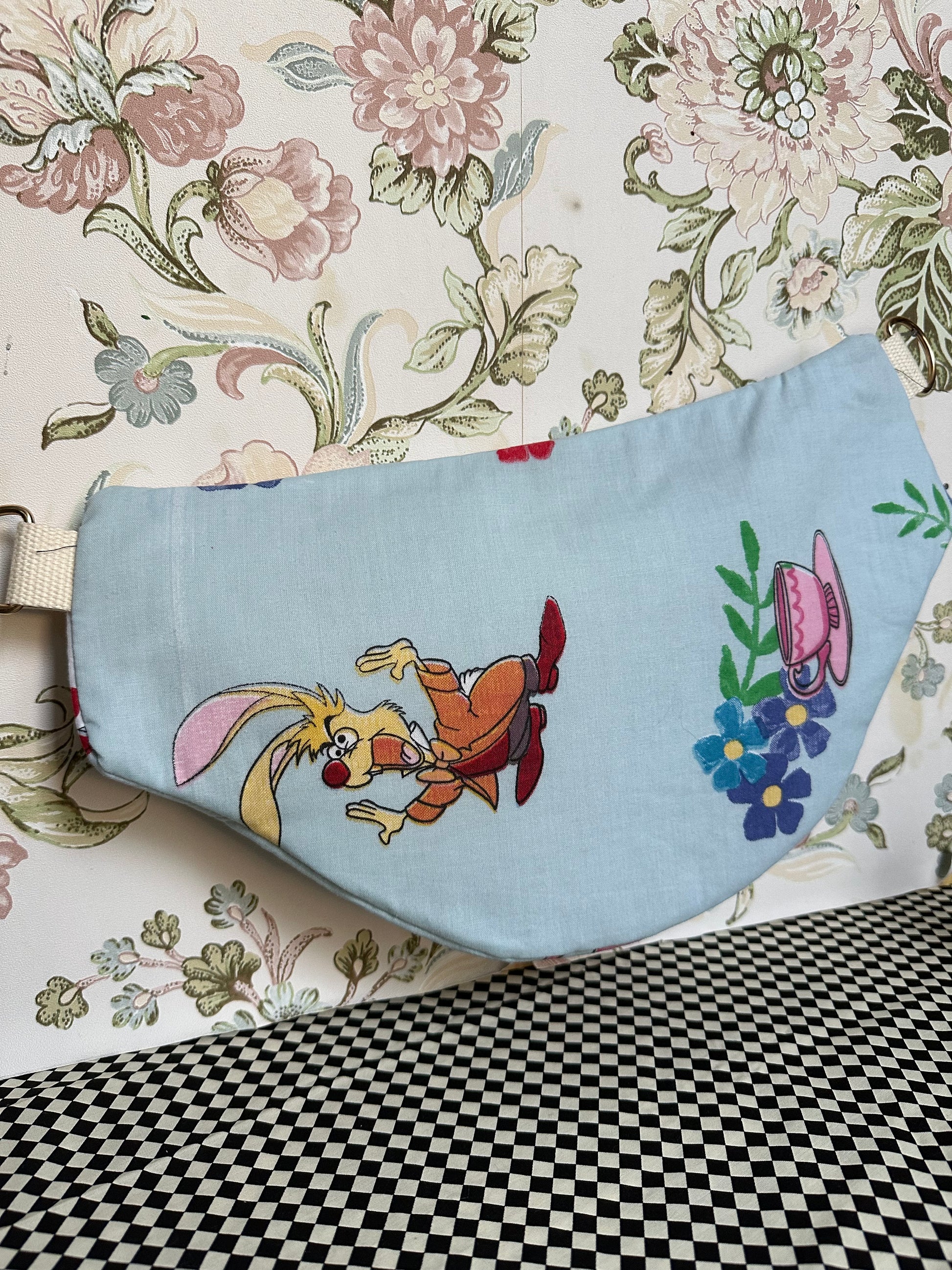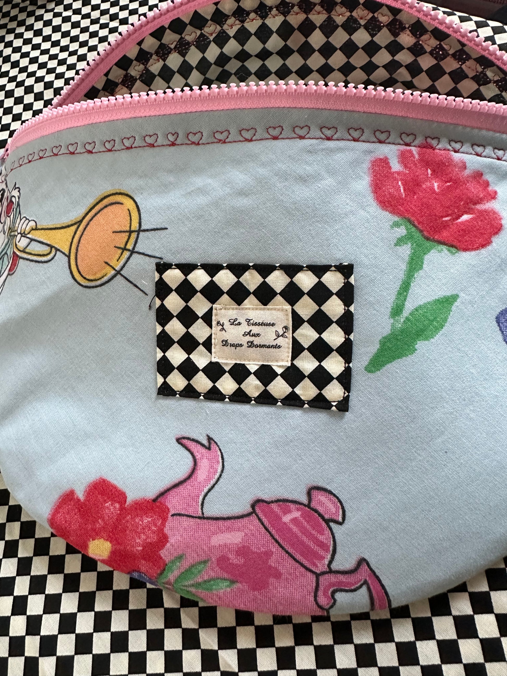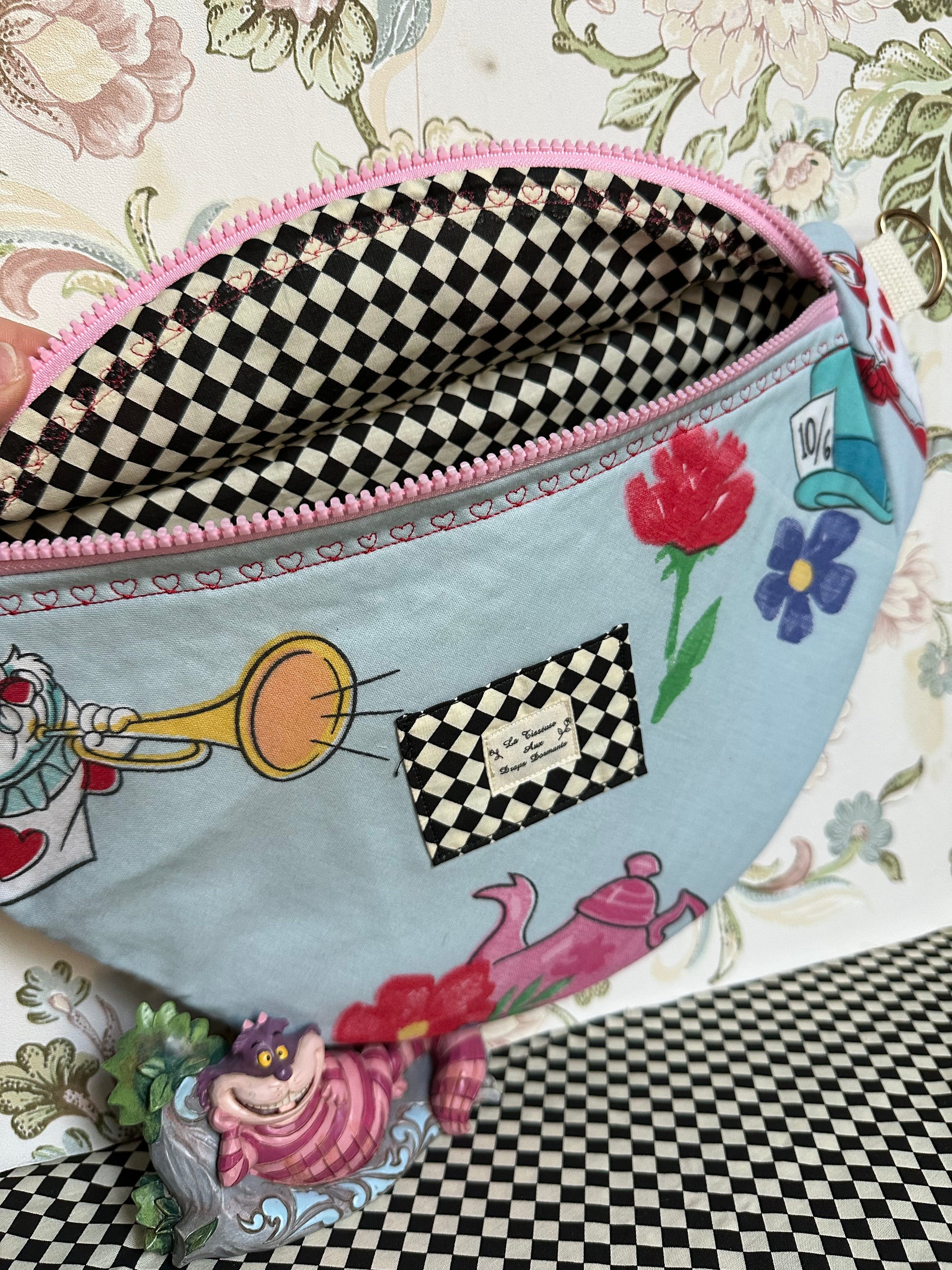 Tissu Alice Univers très rare, doublure intérieure en coton damier noir & blanc. Les bananes sont vendues avec une sangle rose pâle unie, mousquetons dorés.