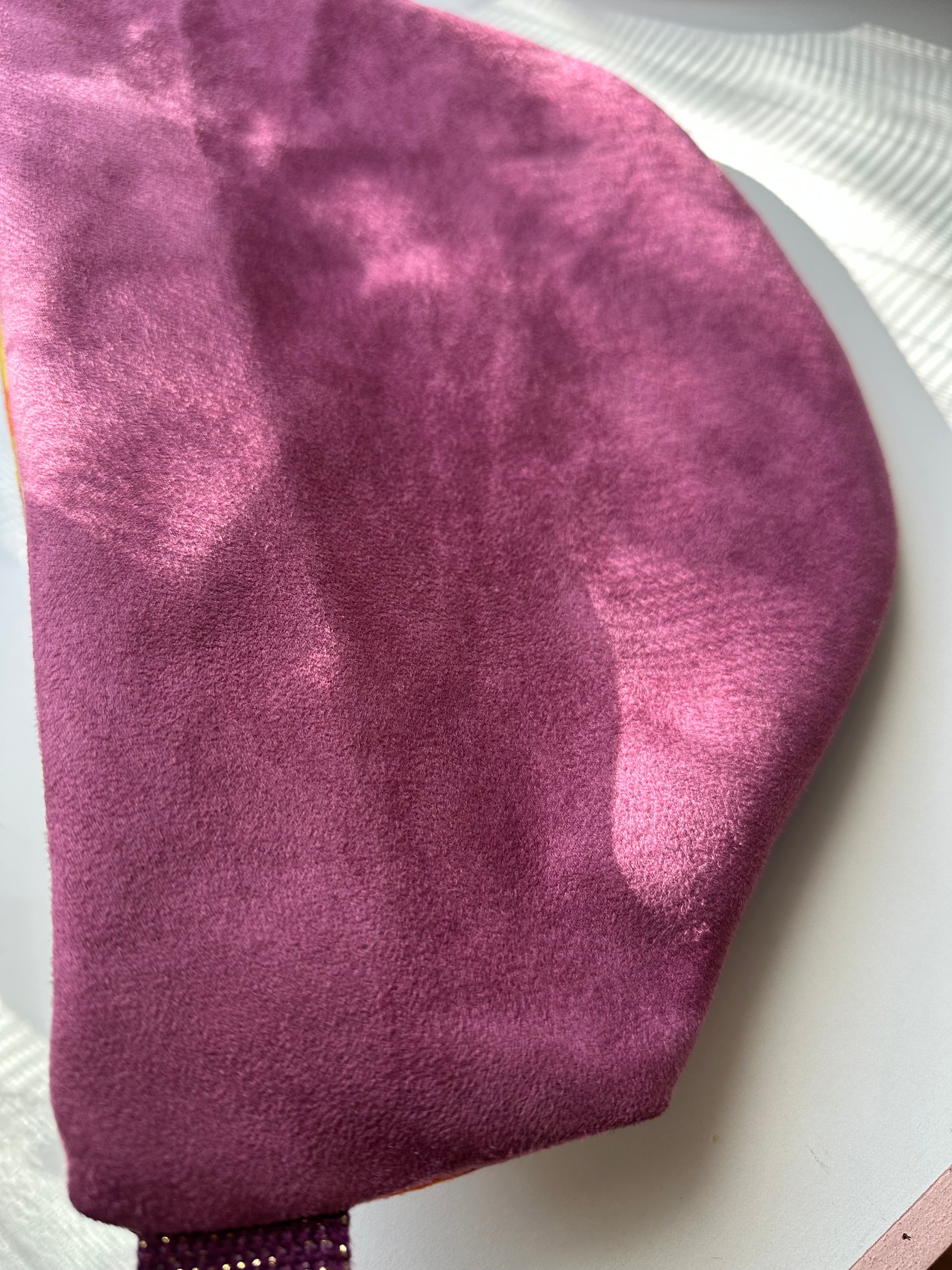 Tissu légendaire rare d’Esmeralda avec doublure intérieure en coton rose. Présence de frange à grelots sur la robe d’Esmeralda (ne fait pas de bruit). Arrière de la banane en velours classique mate mauve. Les bananes sont vendues avec une sangle mauve a paillettes, boucles dorées.