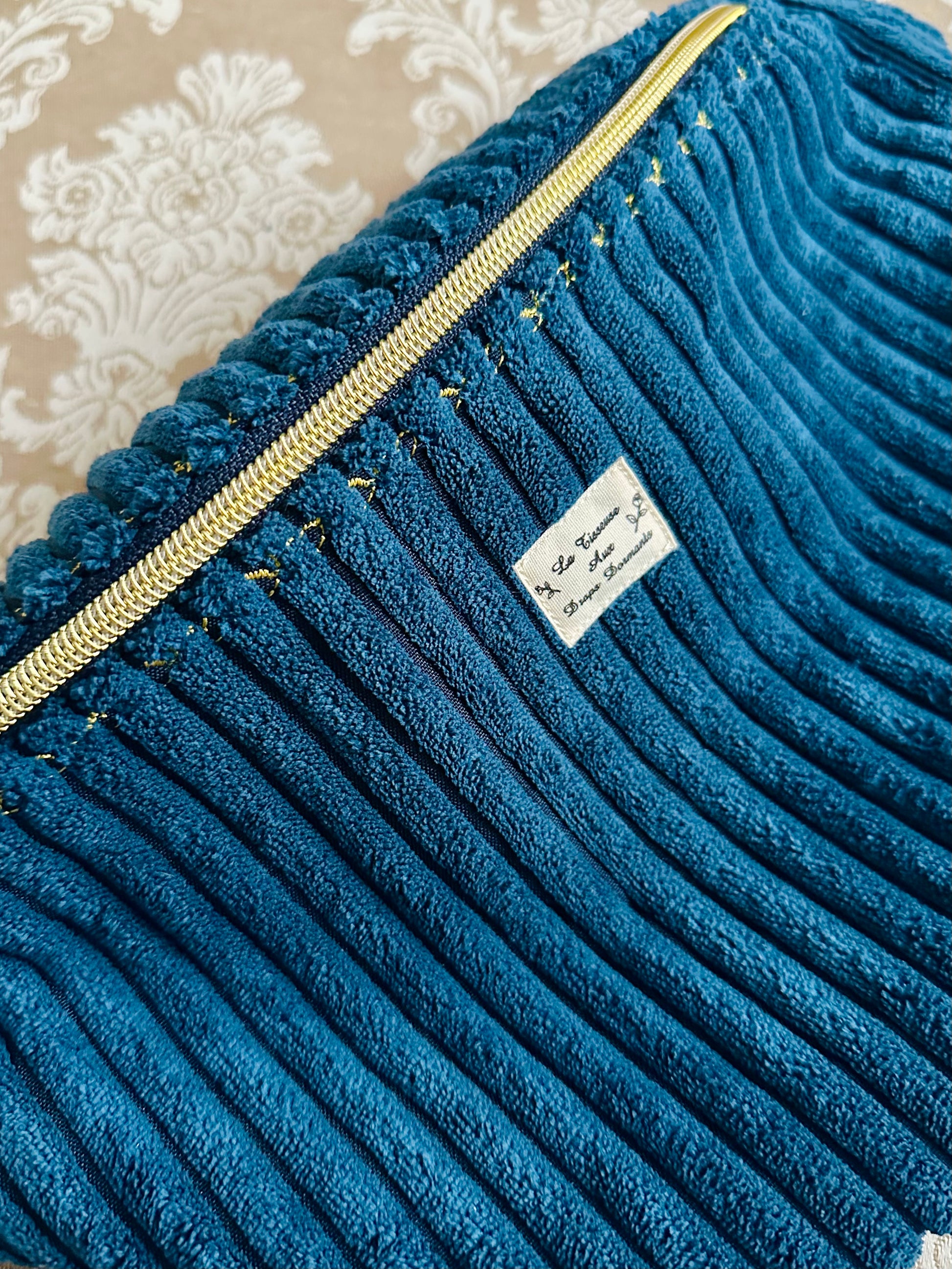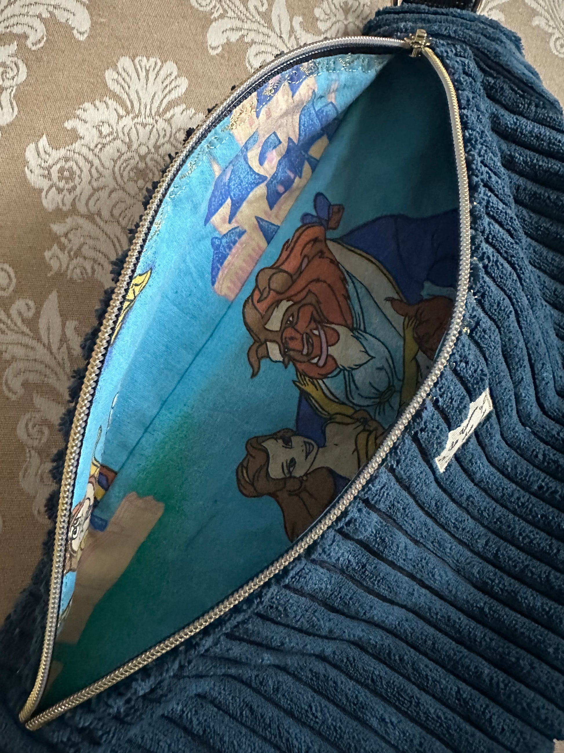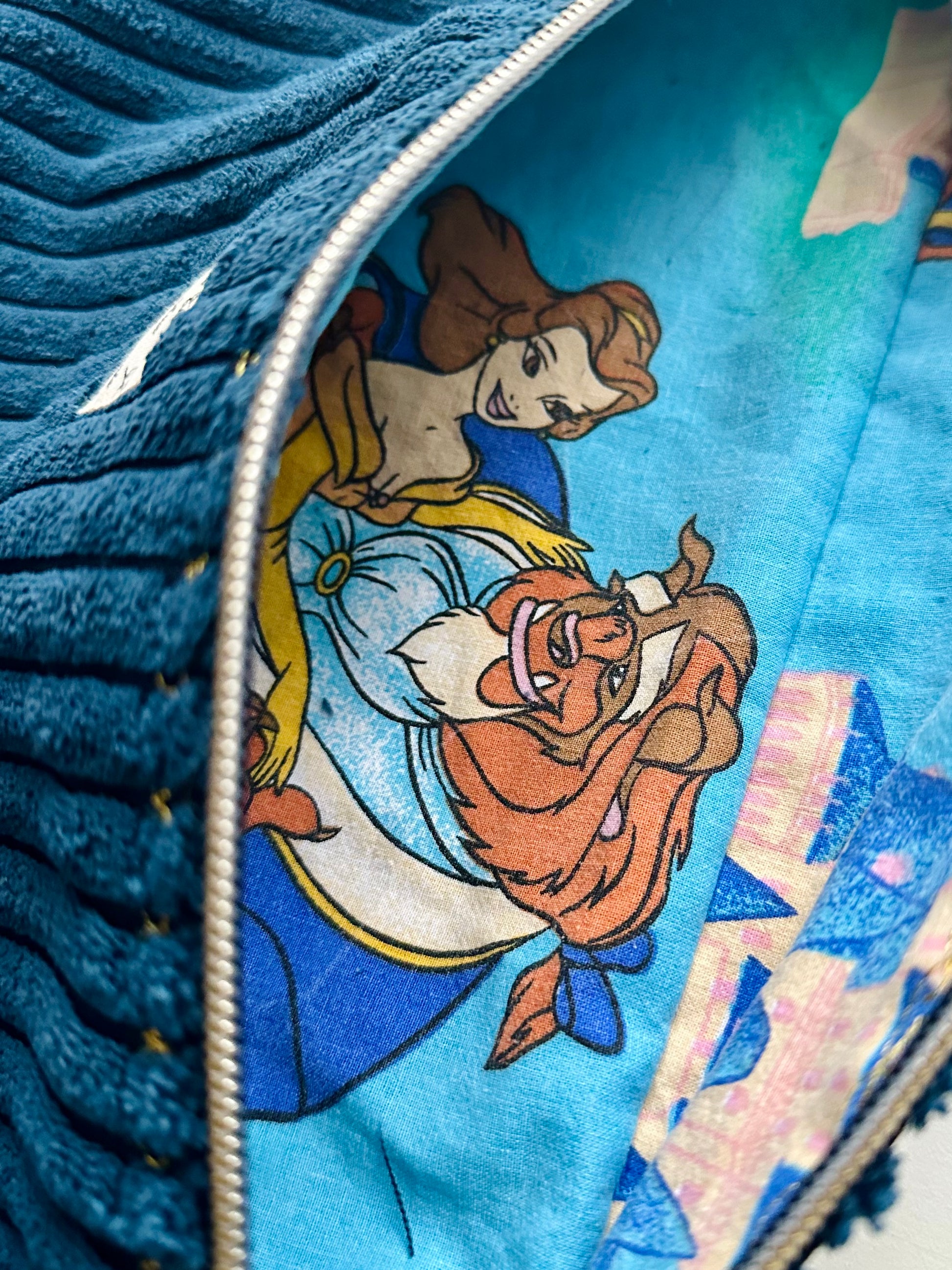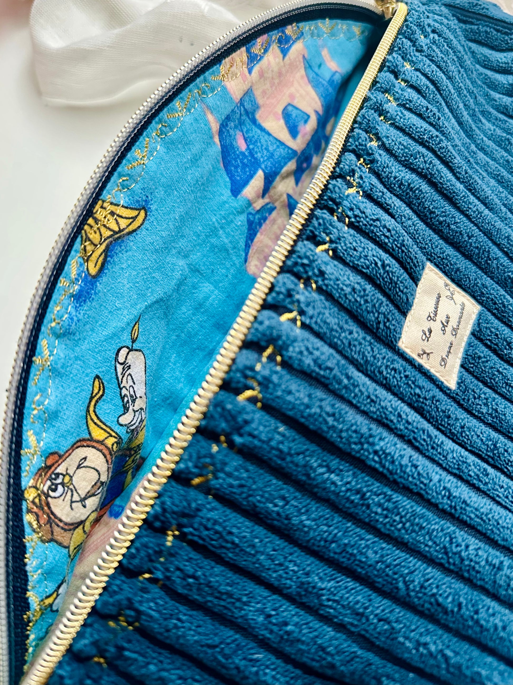 Tissu LÉGENDAIRE Histoire Éternelle en guise de doublure intérieure, avec extérieur en velours côtelé bleu nuit. Immersion totale dans le bal magique de ce conte. Modèle Incognita.