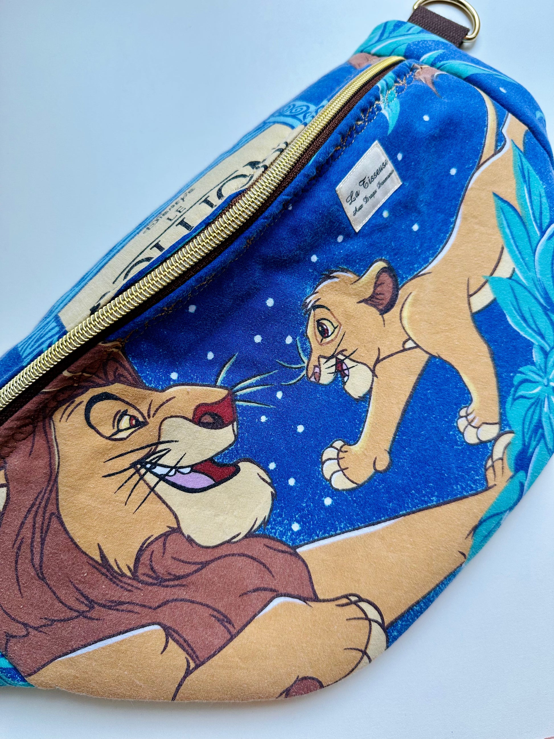 Tissu du Roi Lion, Disney authentique avec doublure intérieure en coton bleu canard. Les bananes sont vendues avec une sangle marron foncée et mousquetons dorés. Tissu Authentique.